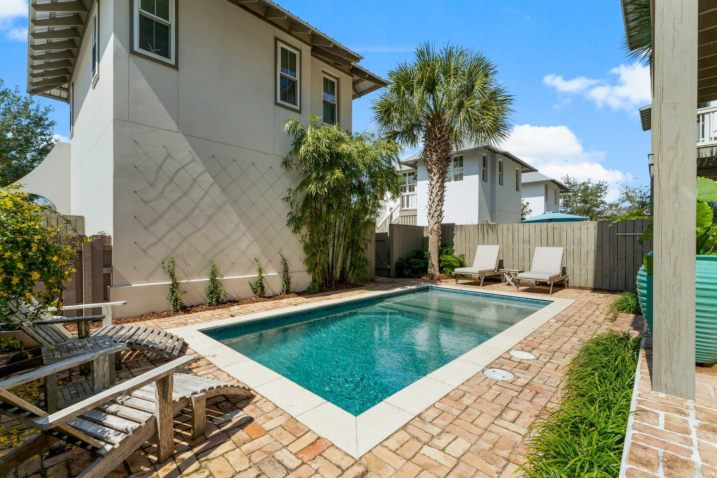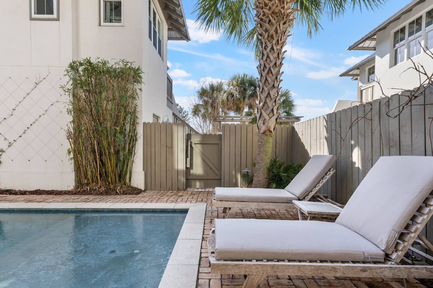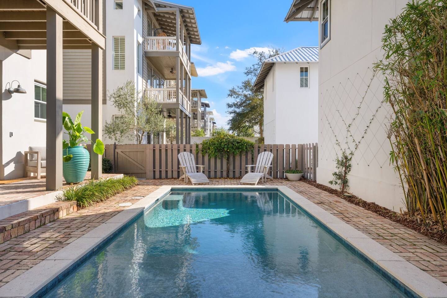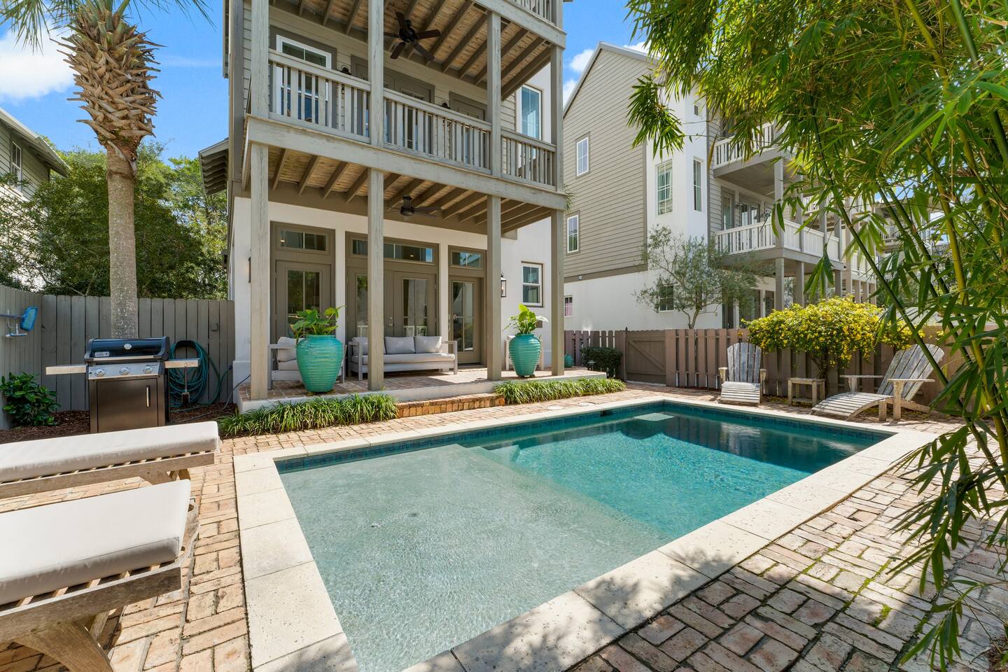 Chateau Winston is a large 4-bedroom house with a private patio and pool that can be heated for an additional fee of $50/day. There are 3 bedrooms with king beds and 1 bedroom with 2 sets of single-size bunk beds (this room is open to the hallway and has a curtain for privacy). The space is perfect for large groups and extended families traveling together. There is plenty of room for everyone to have their own space, and to gather together around the pool or in the large kitchen. Chateau Winston is located on Winston Lane, right at the edge of Inlet and Rosemary Beach. The nearest beach access is a one-block easy walk to the end of our street. The shops and restaurants at Rosemary beach are a five-minute walk away, and the other infamous 30A beach towns of Alys Beach, Seacrest, and more are a close walk or bike ride away. Whole foods and Publix grocery stores are nearby and offer delivery.