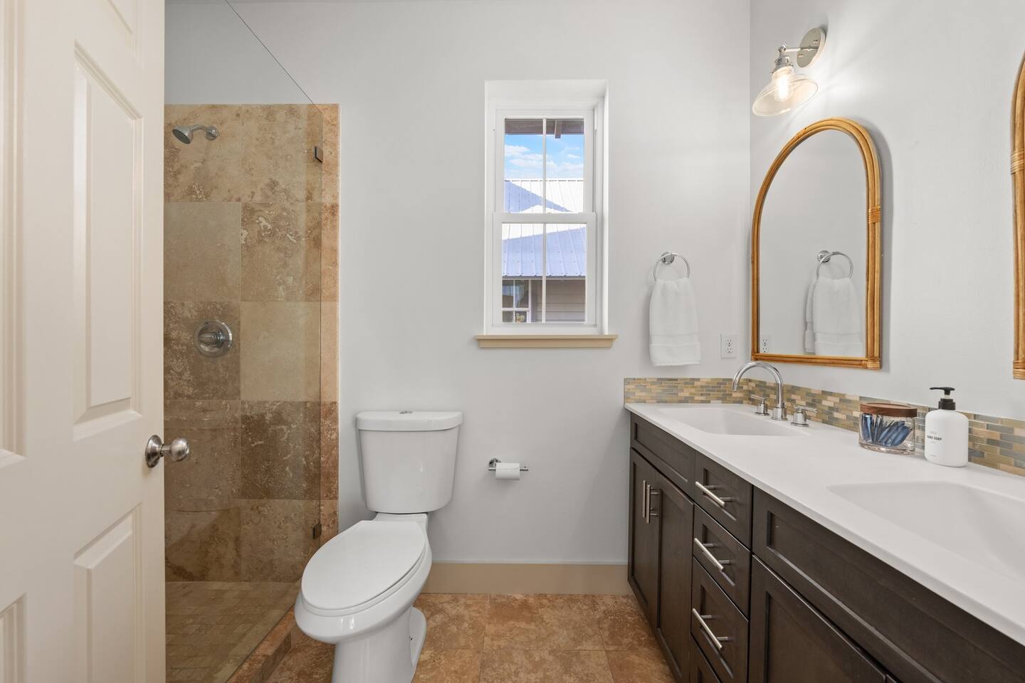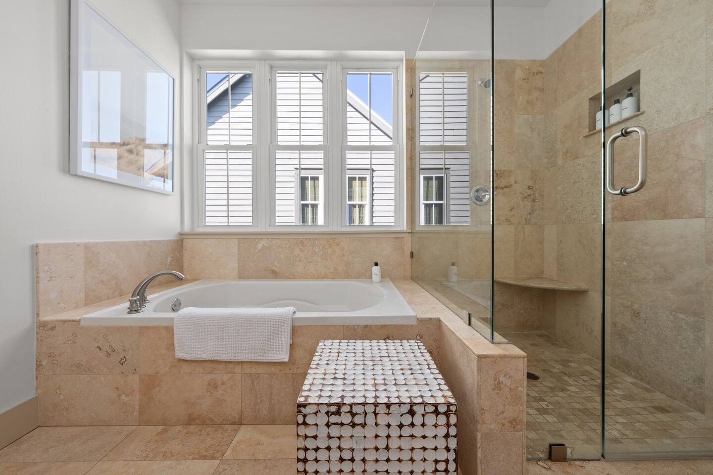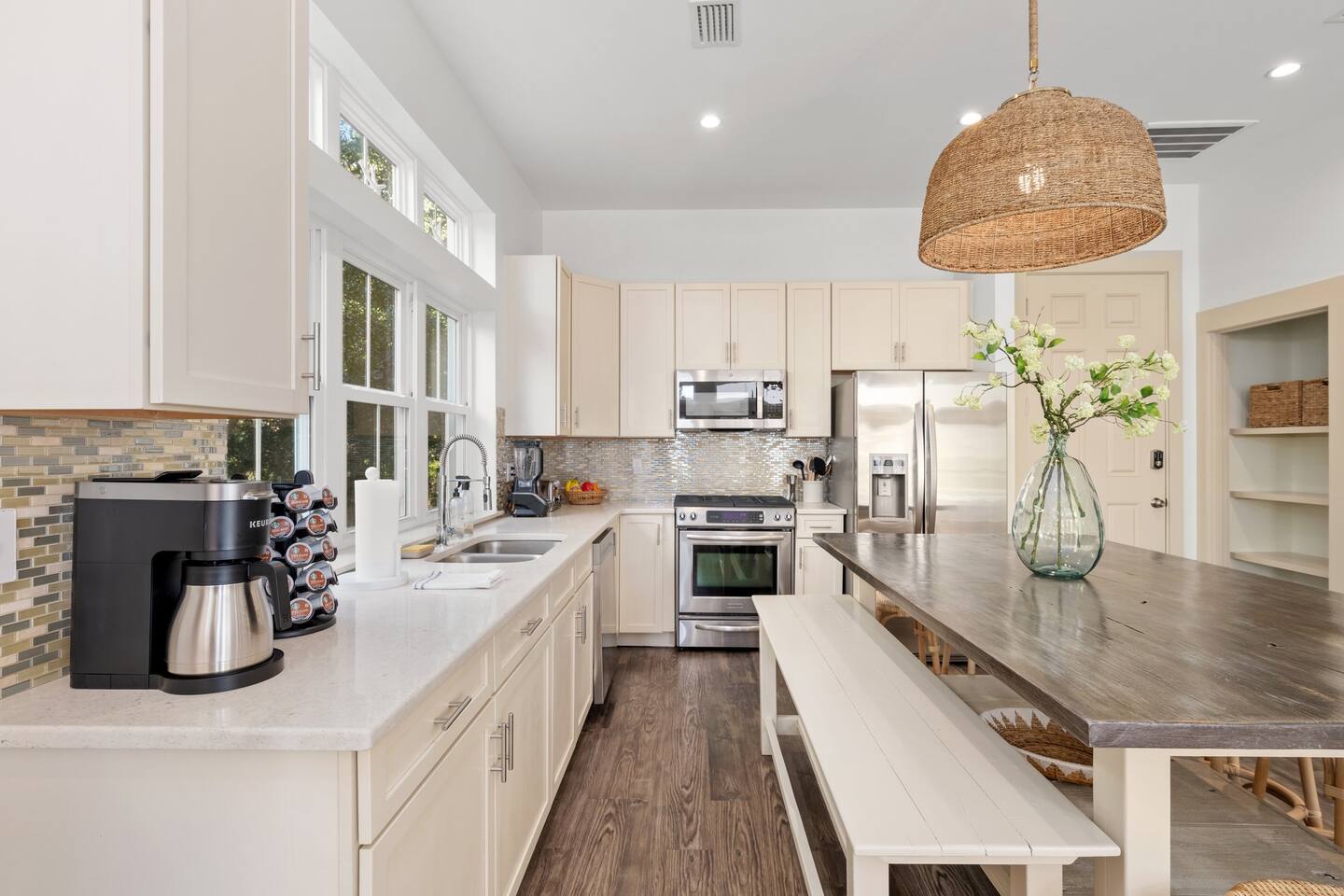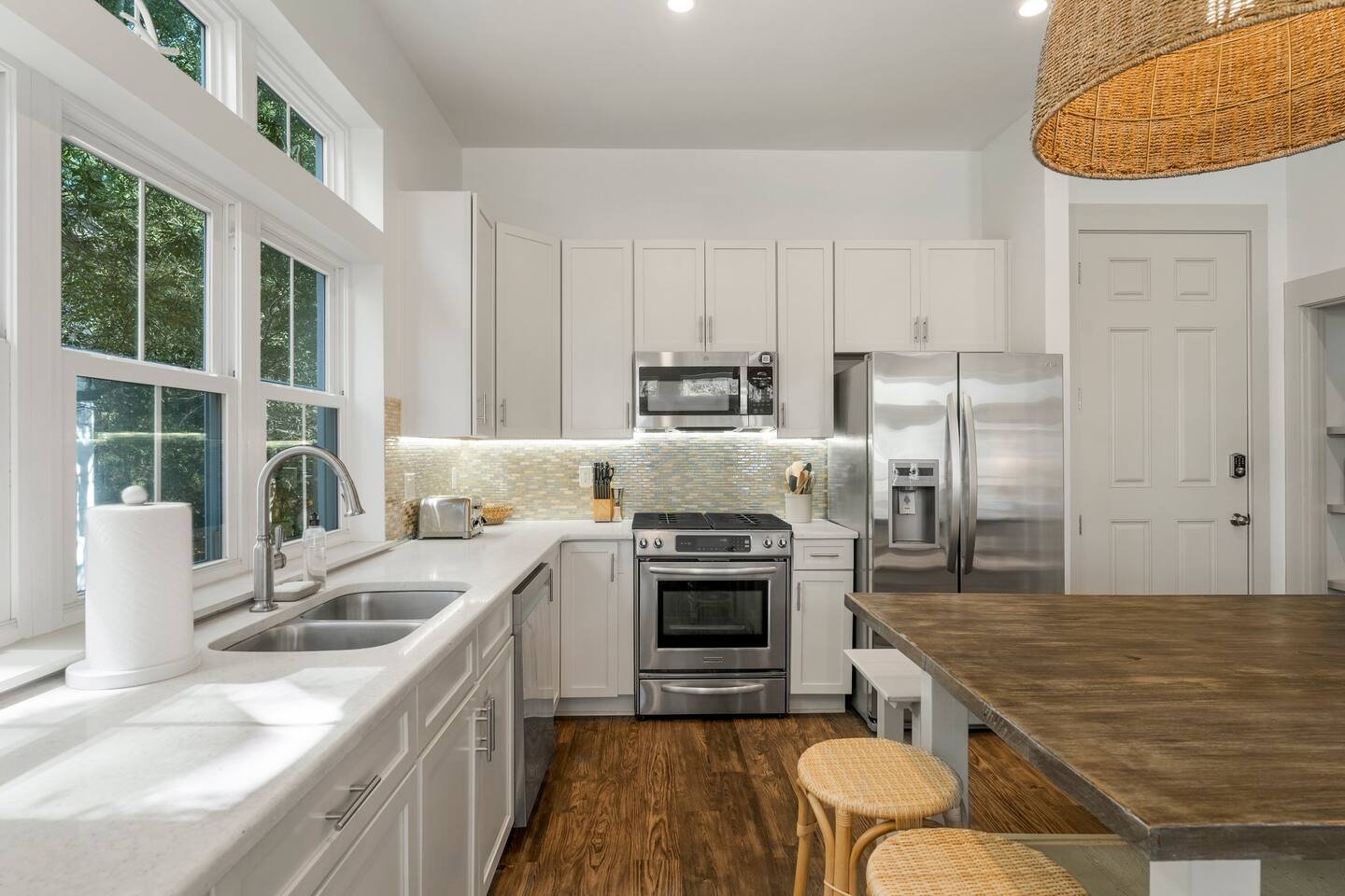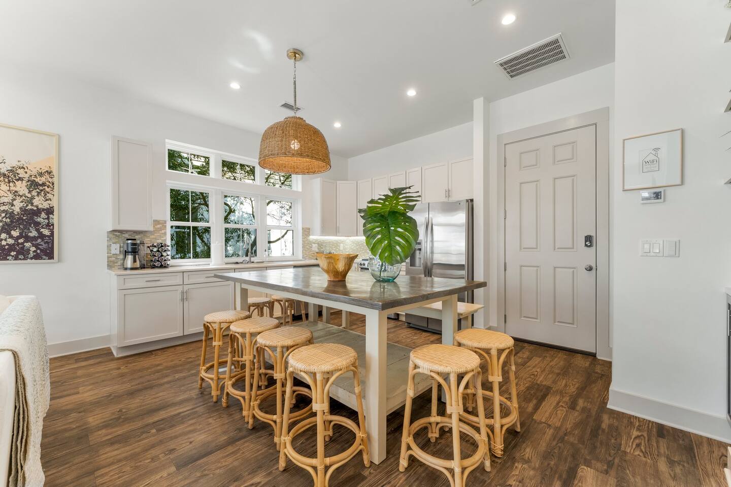 Chateau Winston is a large 4-bedroom house with a private patio and pool that can be heated for an additional fee of $50/day. There are 3 bedrooms with king beds and 1 bedroom with 2 sets of single-size bunk beds (this room is open to the hallway and has a curtain for privacy). The space is perfect for large groups and extended families traveling together. There is plenty of room for everyone to have their own space, and to gather together around the pool or in the large kitchen. Chateau Winston is located on Winston Lane, right at the edge of Inlet and Rosemary Beach. The nearest beach access is a one-block easy walk to the end of our street. The shops and restaurants at Rosemary beach are a five-minute walk away, and the other infamous 30A beach towns of Alys Beach, Seacrest, and more are a close walk or bike ride away. Whole foods and Publix grocery stores are nearby and offer delivery.