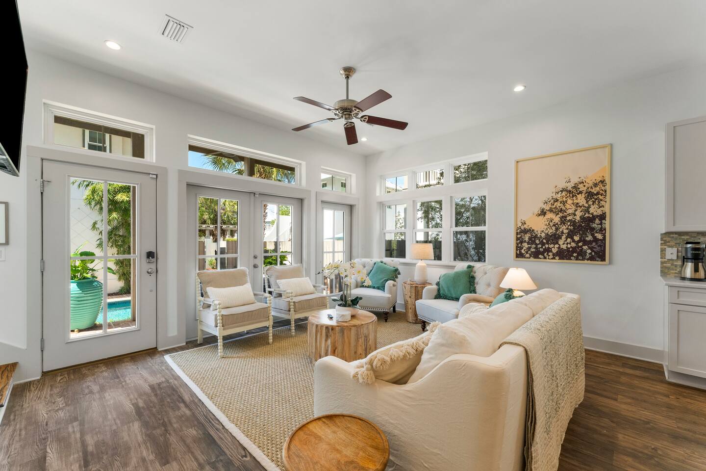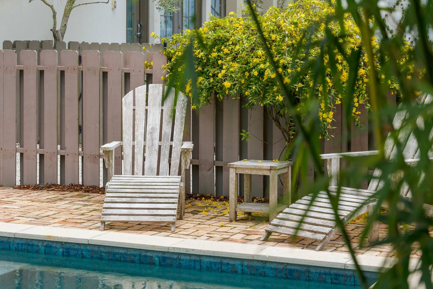 This listing includes both houses on the property. One main house that overlooks the pool, as well as the carriage house that faces the street. The main house has 4-bedrooms with a private patio and pool that can be heated for an additional fee of $50/day. This includes 3 ensuite bedrooms with king beds and 1 bedroom with 4 single-size bunk beds (This room is open to the hallway and has a curtain for privacy) The carriage house is a studio-style apartment with a queen bed in the bedroom area that is separate but open to the main living area. There is also a queen-sized sofa bed in the living area that can accommodate 2 additional people. There is also a small kitchenette with a stove, microwave, mini fridge and dishwasher. The property is perfect for large groups and extended families traveling together. There is plenty of room for everyone to have their own space, and to gather together around the pool or in the large main house kitchen. Chateau Winston is located on Winston Lane, right at the edge of Inlet and Rosemary Beach. The nearest beach access is a one-block easy walk to the end of our street. The shops and restaurants at Rosemary beach are a five-minute walk away, and the other infamous 30A beach towns of Alys Beach, Seacrest, and more are a close walk or bike ride away. Whole foods and Publix grocery stores are nearby and offer delivery.